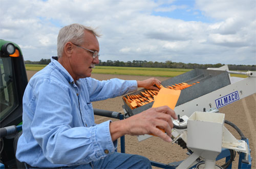 Steve Linscombe, LSU AgCenter rice breeder, loads rice seed into a planter in March during the planting of plots being used to test new lines of rice that could become new varieties. Linscombe said developing new varieties is crucial to farmers. Photo by Bruce Schultz